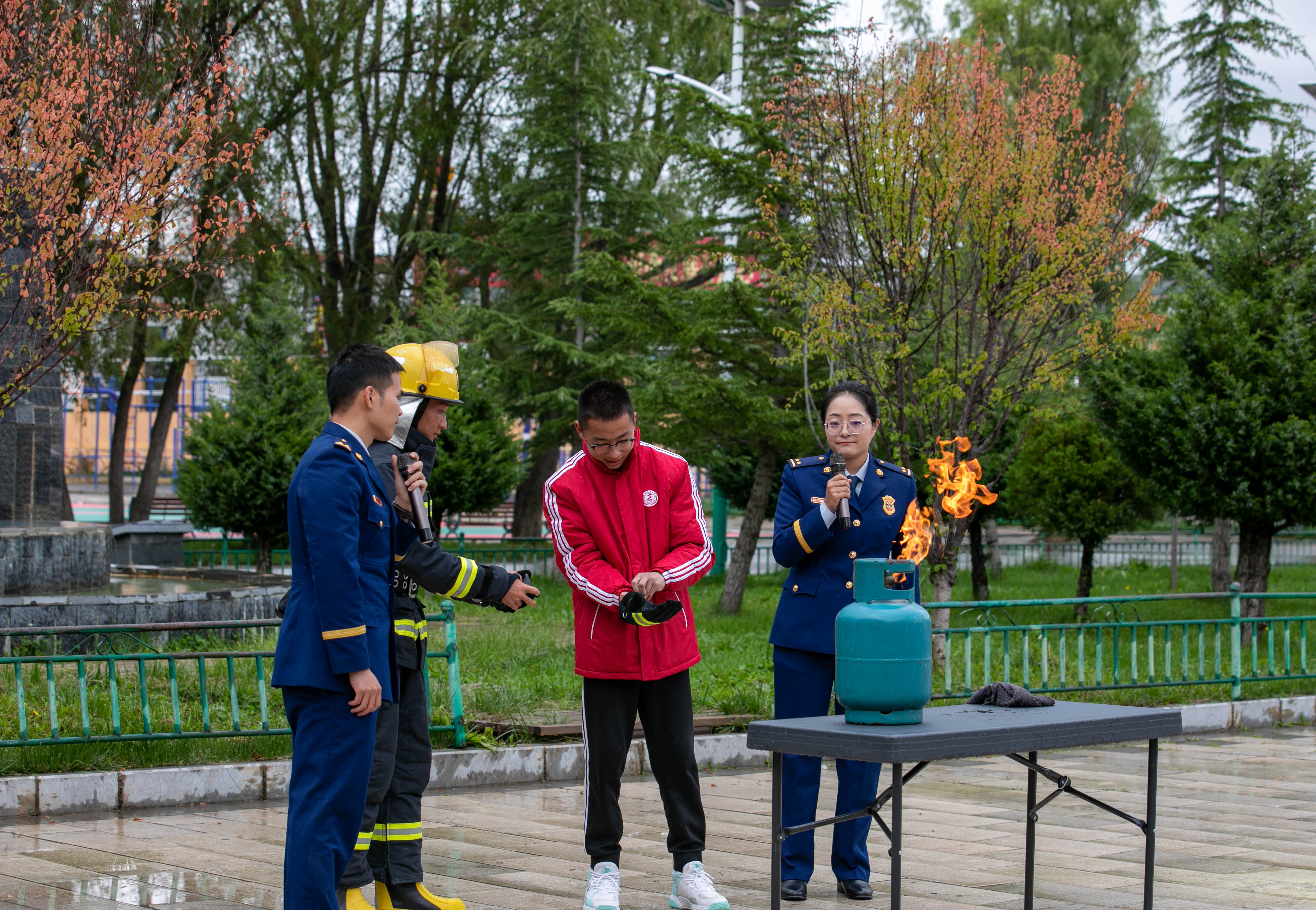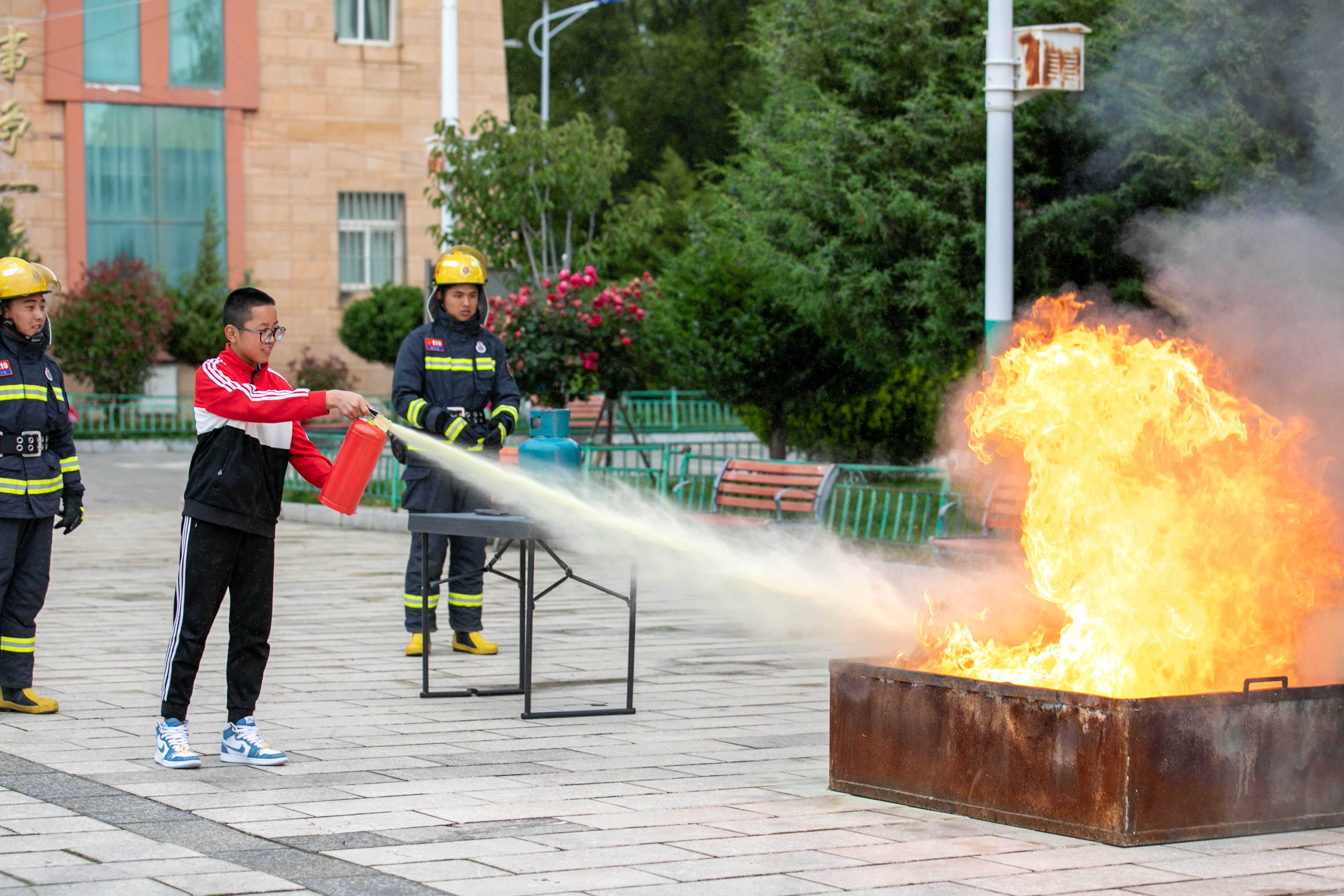 其間,支隊(duì)宣傳員還帶領(lǐng)學(xué)生們 “零距離”參觀體驗(yàn)消防車輛和器材裝備,對(duì)搶險(xiǎn)救援車、液壓破拆系統(tǒng)、手抬機(jī)動(dòng)泵等消防器材裝備進(jìn)行現(xiàn)場(chǎng)講解,讓師生了解器材裝備的用途和使用方法?;顒?dòng)中還開展了真火撲救實(shí)操演練及應(yīng)急疏散逃生實(shí)戰(zhàn)演練。