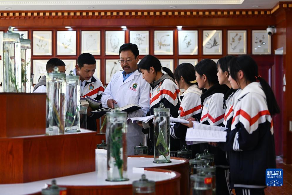 9月8日,在果洛藏族自治州職業(yè)技術(shù)學(xué)校,藏醫(yī)醫(yī)療與藏藥專業(yè)學(xué)生在草藥標(biāo)本館內(nèi)學(xué)習(xí)辨認(rèn)藥材。新華社記者 張龍 攝
