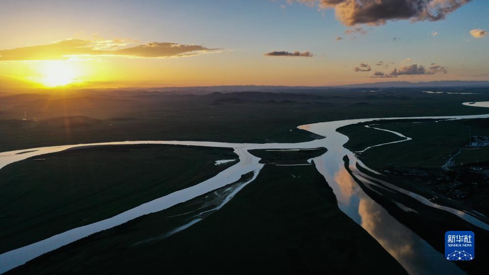 這是8月21日在四川省阿壩藏族羌族自治州若爾蓋縣唐克鎮(zhèn)拍攝的黃河九曲第一灣落日(無人機照片)。新華社記者 王曦 攝