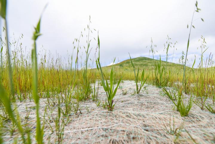 這是在四川省阿壩藏族羌族自治州若爾蓋縣達(dá)扎寺鎮(zhèn)多瑪村廢棄礦山治理點(diǎn)拍攝的“椰絲毯”。新華社記者 王曦 攝