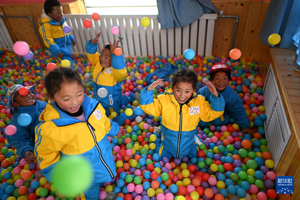 在曲麻萊縣秋智鄉(xiāng)幼兒園,昂文拉毛(右二)和伙伴們?cè)诮淌覂?nèi)玩耍(9月13日攝)。新華社 張宏祥 攝