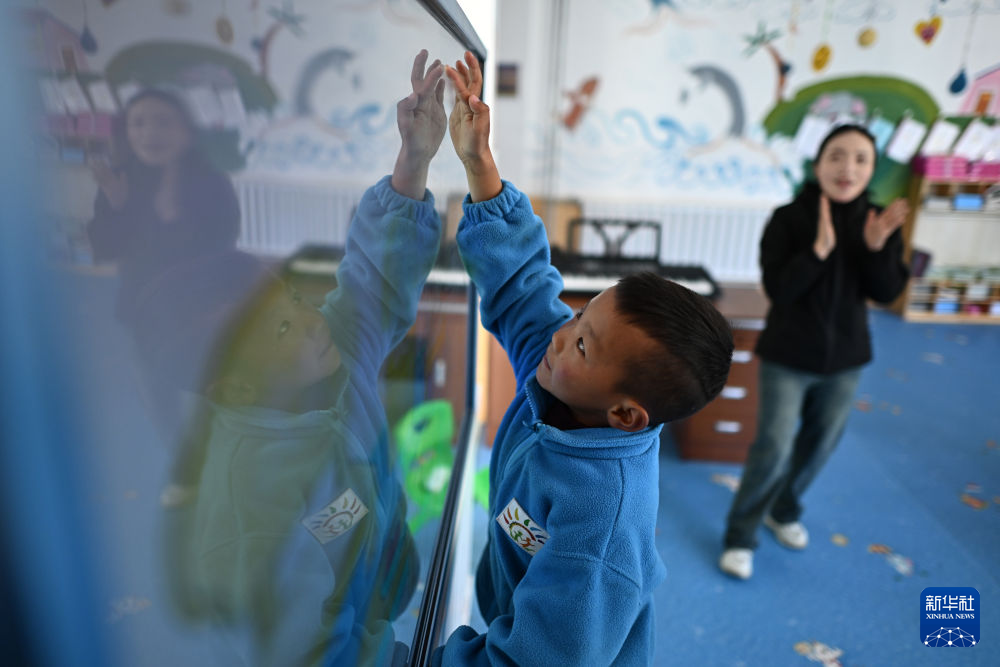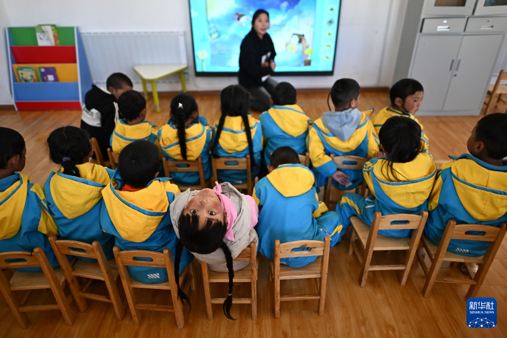 在曲麻萊縣葉格鄉(xiāng)幼兒園,小朋友們?cè)谡n堂上(9月13日攝)。新華社 張宏祥 攝