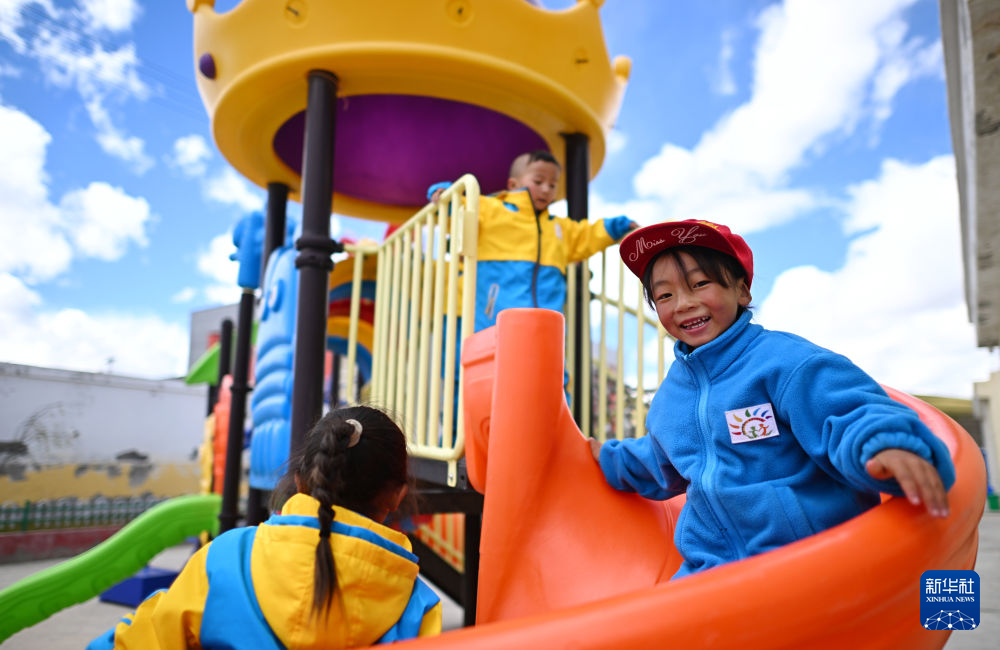在曲麻萊縣秋智鄉(xiāng)幼兒園,仁青卓瑪(右)和伙伴們?cè)谛@內(nèi)玩耍(9月13日攝)。新華社 韓方方 攝