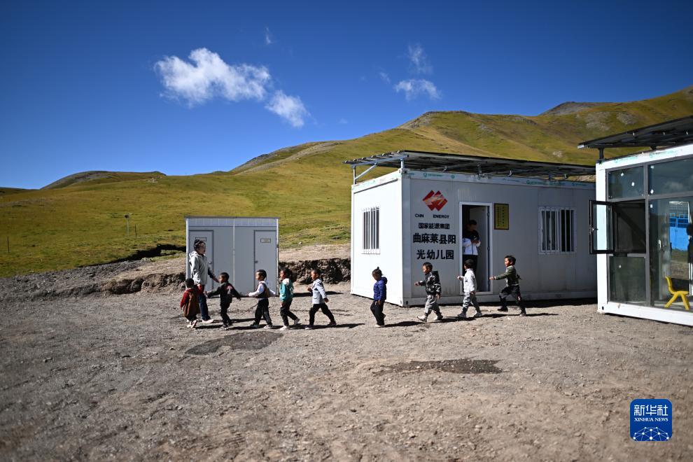 在青海省玉樹藏族自治州曲麻萊縣秋智鄉(xiāng)布甫村陽(yáng)光幼兒園,孩子們走出教室準(zhǔn)備開始戶外活動(dòng)(9月14日攝)。新華社記者 張宏祥 攝