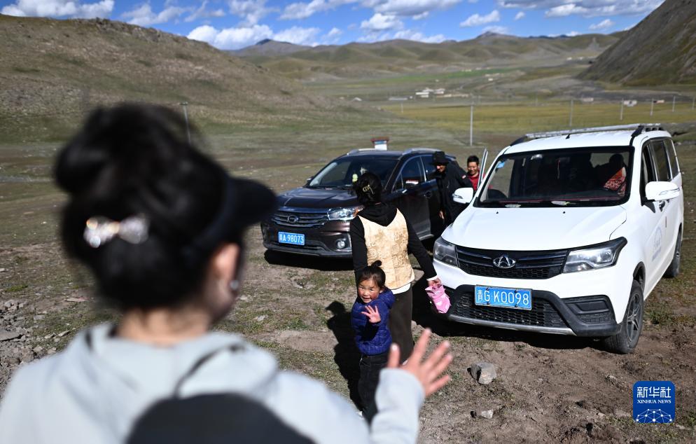在青海省玉樹藏族自治州曲麻萊縣秋智鄉(xiāng)布甫村陽(yáng)光幼兒園,孩子們?cè)诜艑W(xué)后與老師告別(9月14日攝)。新華社記者 張宏祥 攝