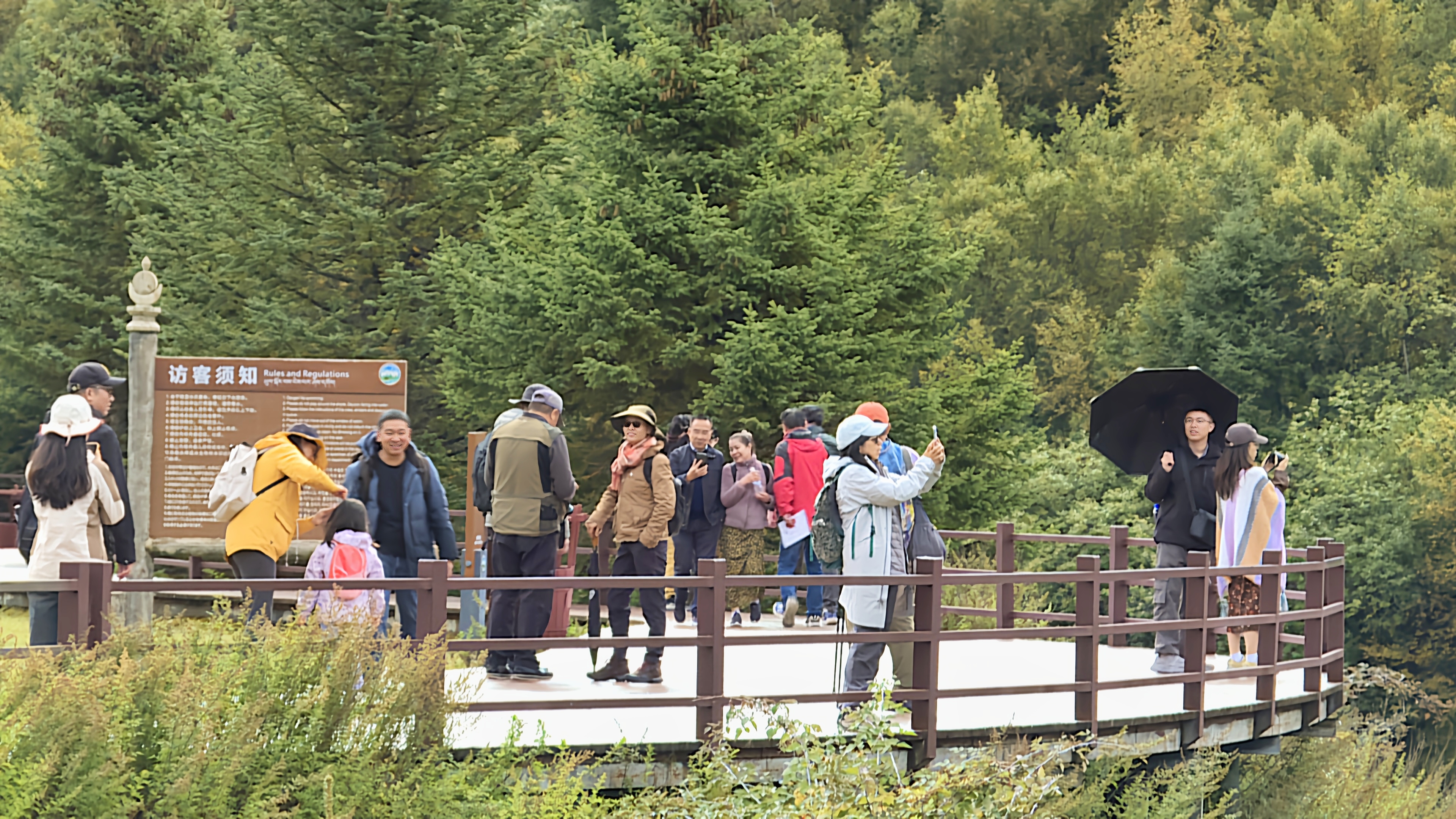 秋日的普達(dá)措國(guó)家公園層林盡染、色彩斑斕,高山草甸、原始森林與湖泊濕地構(gòu)成了一幅幅美麗的畫(huà)卷,屬都湖棧道上人群熙熙攘攘?!拔沂堑谝淮蝸?lái)香格里拉旅游,香格里拉給我的感覺(jué)就是,這里的生態(tài)環(huán)境保護(hù)得很好,綠水青山,很值得來(lái)游玩?!庇慰退闻勘硎?。
