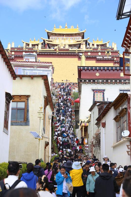 擁有著“小布達(dá)拉宮”和“藏族藝術(shù)博物館”之稱(chēng)的噶丹·松贊林寺人氣高漲,不少游客身著藏民族服飾欣喜地在景區(qū)寺院的金頂、黃墻下合影留念。景區(qū)外車(chē)水馬龍,停車(chē)場(chǎng)及公路沿線兩側(cè)停滿(mǎn)了來(lái)自全國(guó)各地的自駕游車(chē)輛,交警及景區(qū)工作人員井然有序的指揮著交通。景區(qū)內(nèi),游客源源不斷,在上車(chē)點(diǎn)排起了長(zhǎng)隊(duì),工作人員忙碌地指引著游客按秩序檢票上車(chē),“人實(shí)在太多了,假期以來(lái)從早上7點(diǎn)至晚上7點(diǎn)半都有游客進(jìn)出,19輛擺渡車(chē)都在不停運(yùn)行?!币晃痪皡^(qū)工作人員告訴記者。