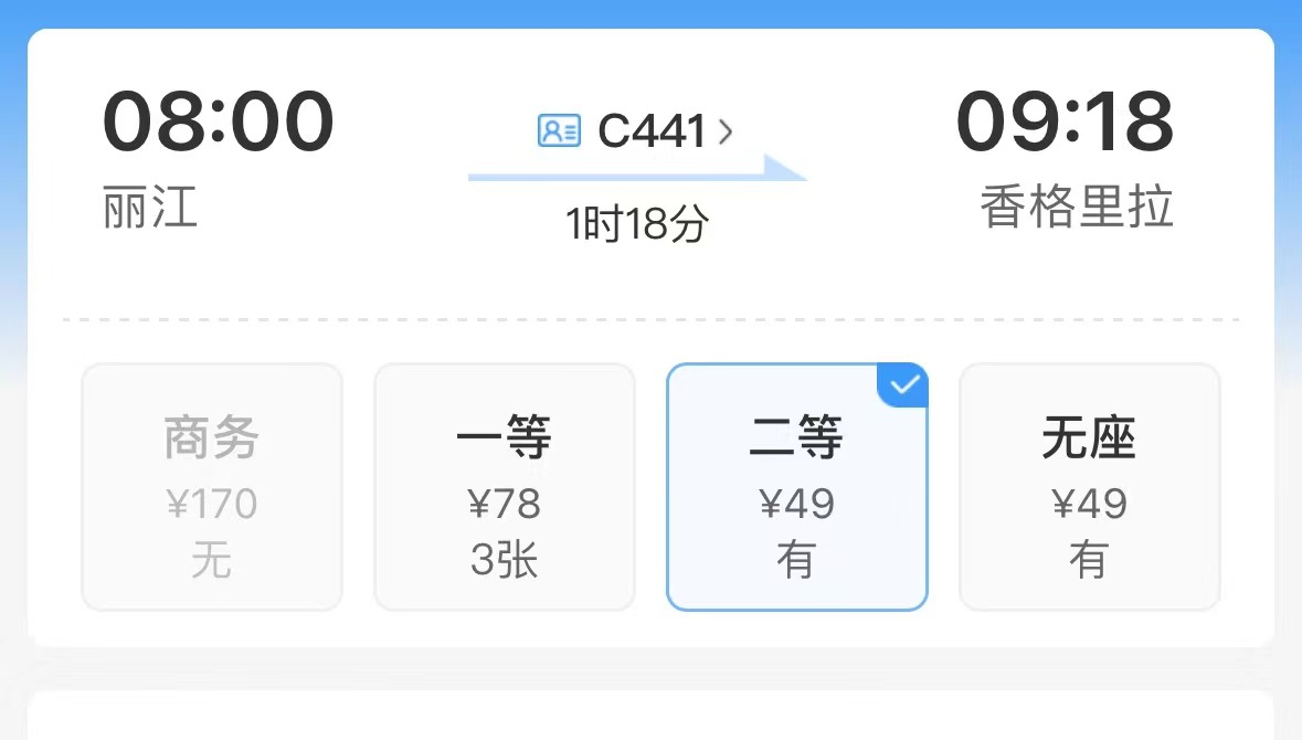 麗香鐵路開通至今熱度較高,鐵路12306購票平臺顯示,多趟班次已出現(xiàn)坐票售罄或無票的情況。根據(jù)香格里拉站工作人員建議,為保證沿線其他車站乘客購票,APP票量實時變動更新,建議買不到票的乘客實時刷新APP,買不到坐票的乘客可以上車后向乘務(wù)員詢問各車廂是否有空余座位。