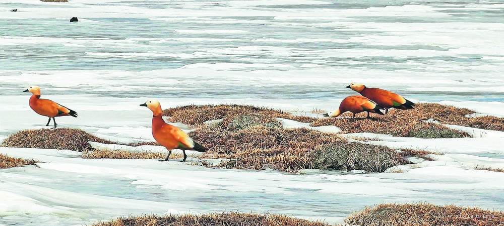 3月8日,青海省玉樹藏族自治州隆寶灘國(guó)際重要濕地迎來春天首批赤麻鴨12只,身披赤黃褐色的“彩衣”赤麻鴨,或游走在草灘上棲息覓食,或展翅翱翔天空,或在冰面上歇息,讓隆寶灘國(guó)際重要濕地在春季充滿了勃勃生機(jī)。