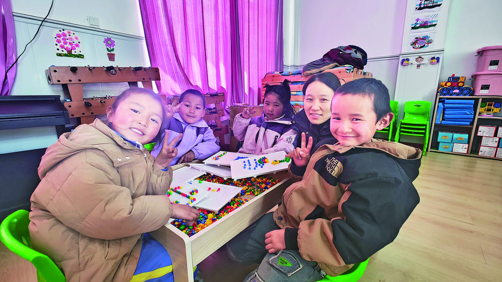 夏拉幼兒園的小朋友正在和老師做手工。楊紅霞 攝