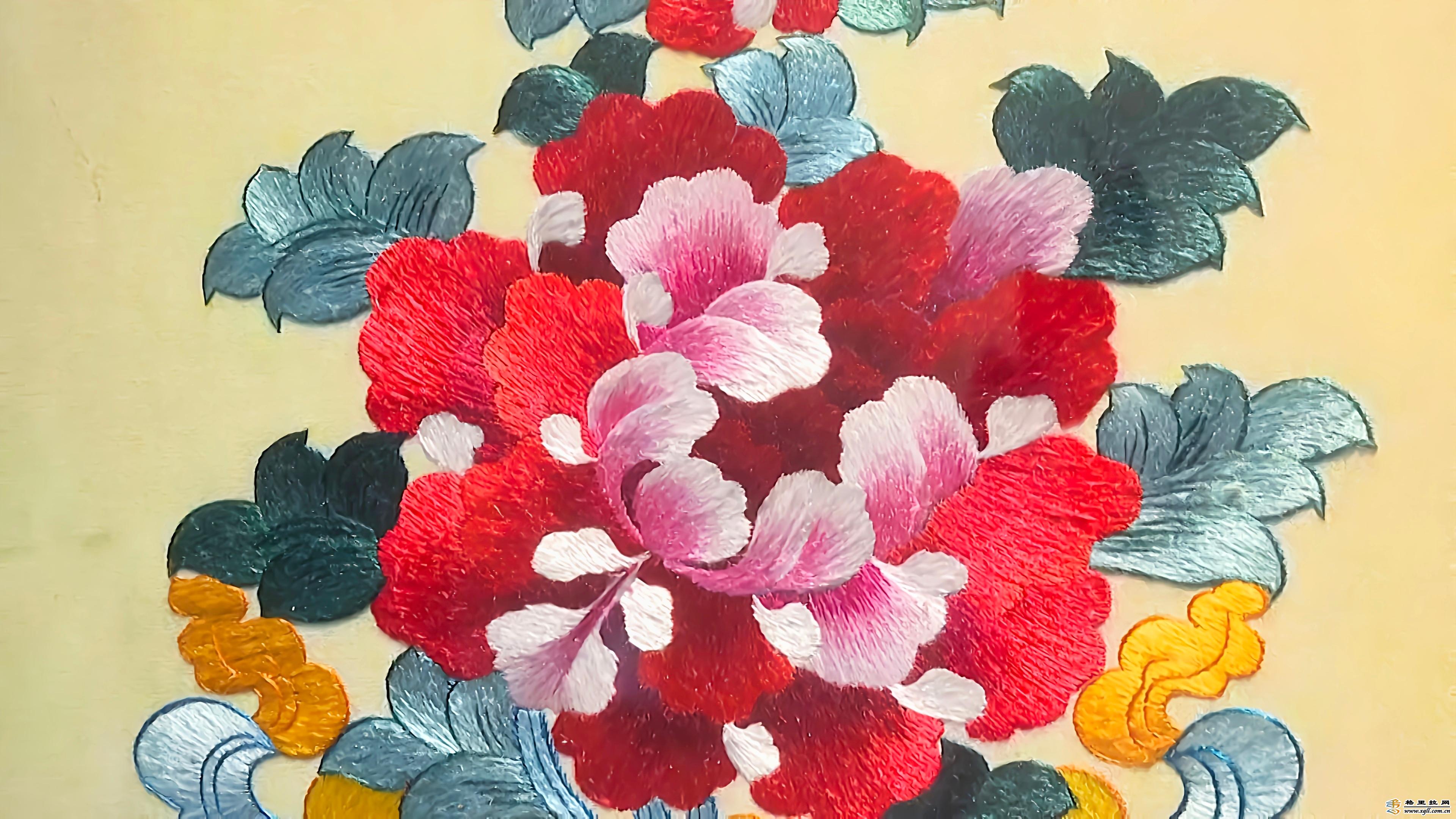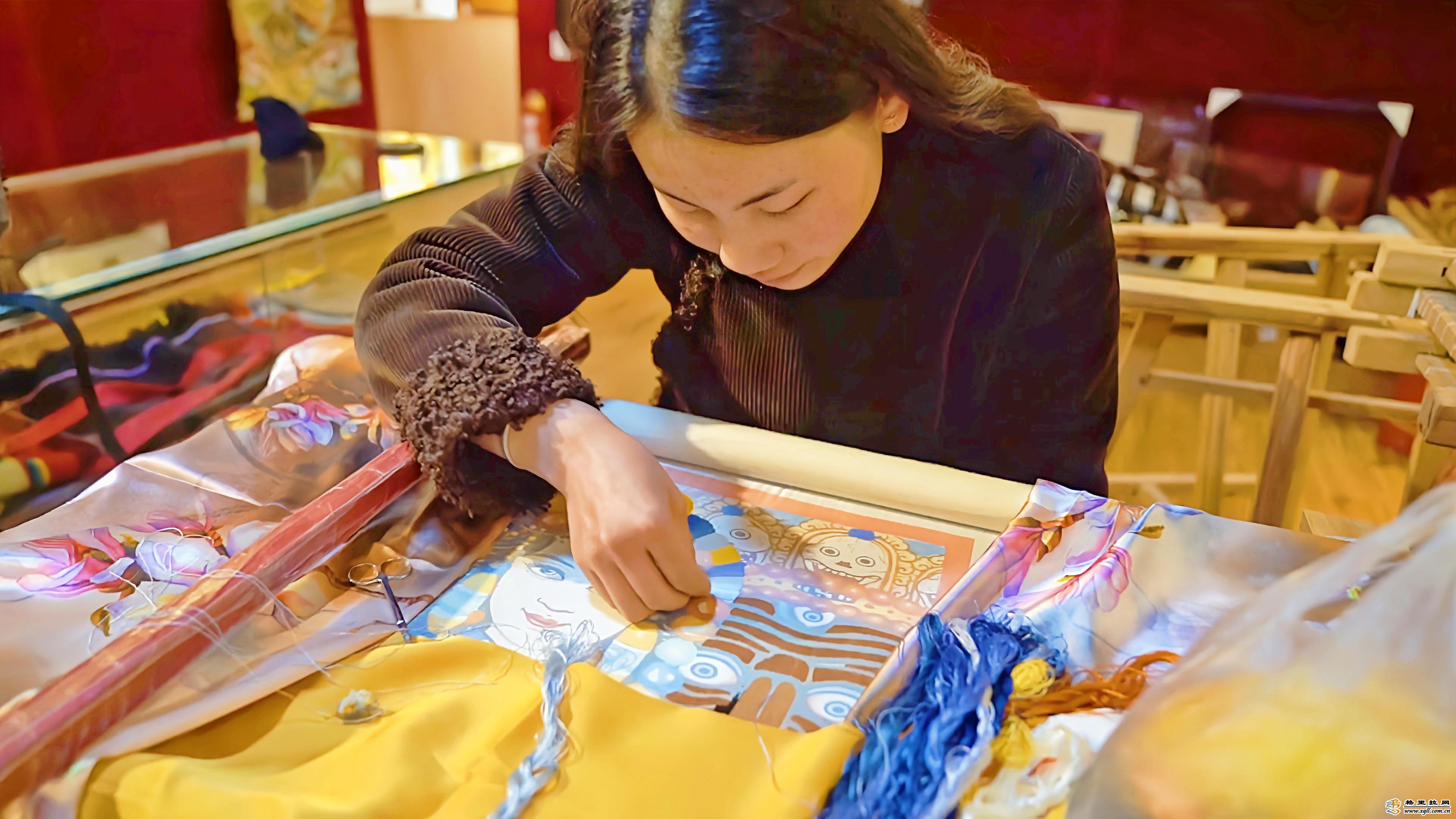 走進位于獨克宗古城的香格里拉藏繡文化藝術(shù)院,一件件精美的手工藏繡作品陳列在展館內(nèi)。堆繡、盤金、打籽針法展示出不同風格的藏繡手法,細韌、明亮而又富有彈性的絲線使得繡品艷麗而有光澤,吸引著南來北往的游客前來參觀。