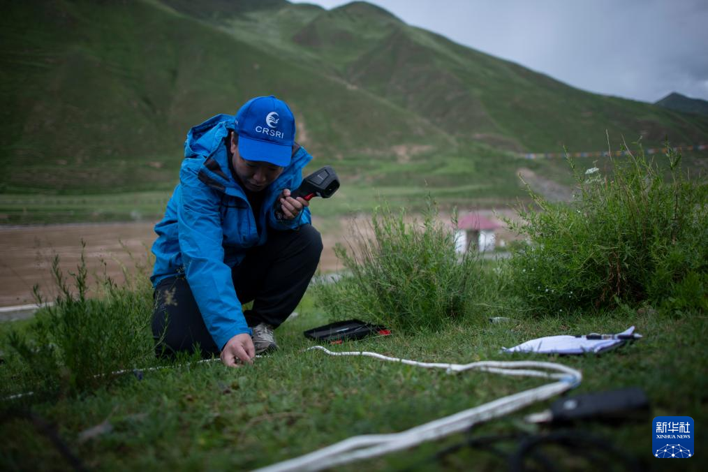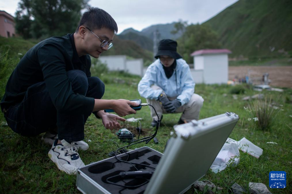 7月20日,在直門達(dá)水文站,長江科學(xué)院空間信息技術(shù)應(yīng)用研究所廖茂昕(左)和付珺琳進(jìn)行土壤多參數(shù)檢測。新華社記者 伍志尊 攝