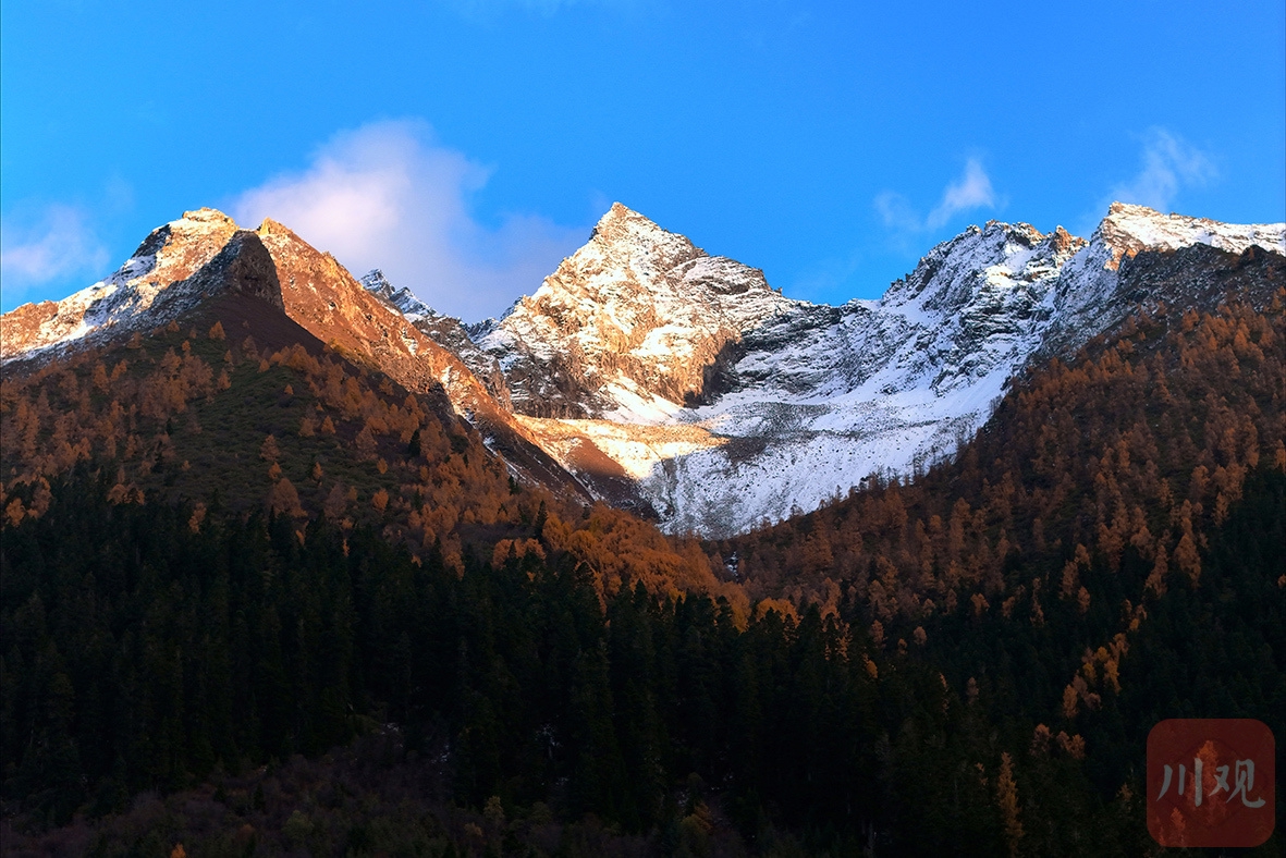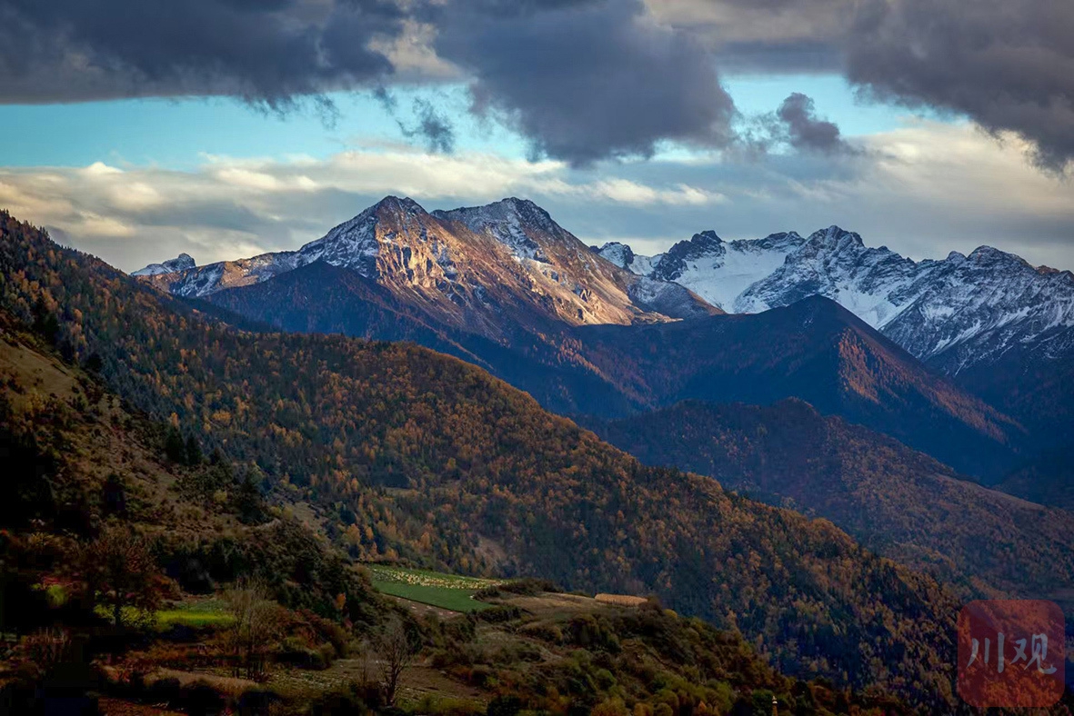 瑪嘉溝里,初冬仍有金秋余韻,金黃與火紅交織成樹木的盛裝。溪流潺潺,倒映著山色,樹葉如雪花飄落,鋪在小徑上,腳步踏上去沙沙作響,山陰處有初雪;行徑在夢(mèng)筆山理小路,沿小路前行別具風(fēng)情,仿佛能穿越時(shí)空。初雪覆蓋的山巒在陽(yáng)光下閃耀金光,與青稞田構(gòu)成一幅絕美的田園風(fēng)光。