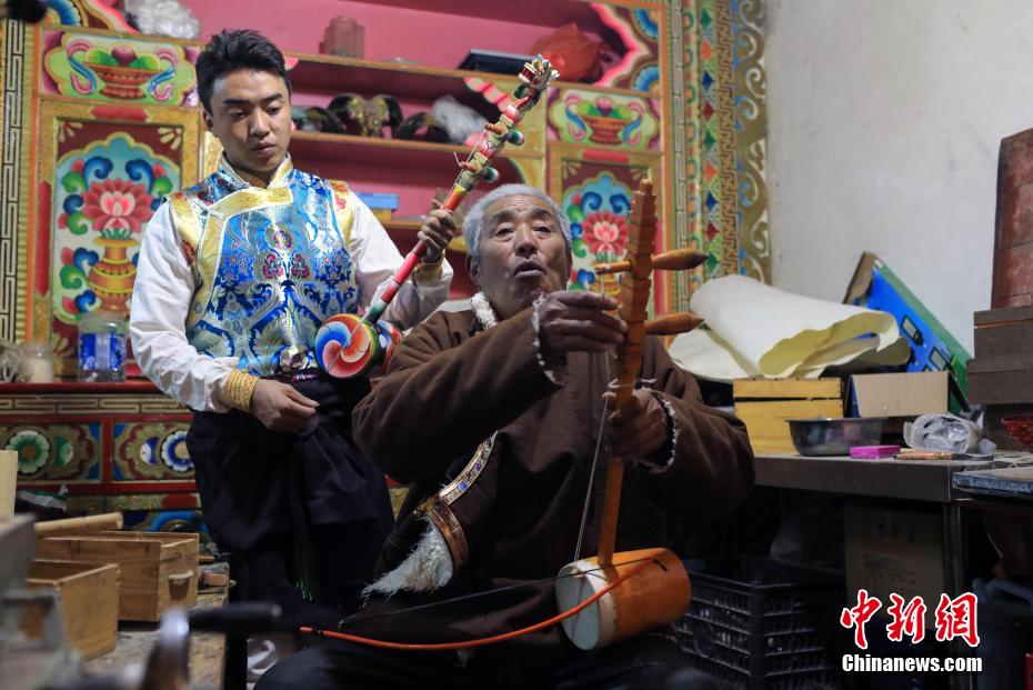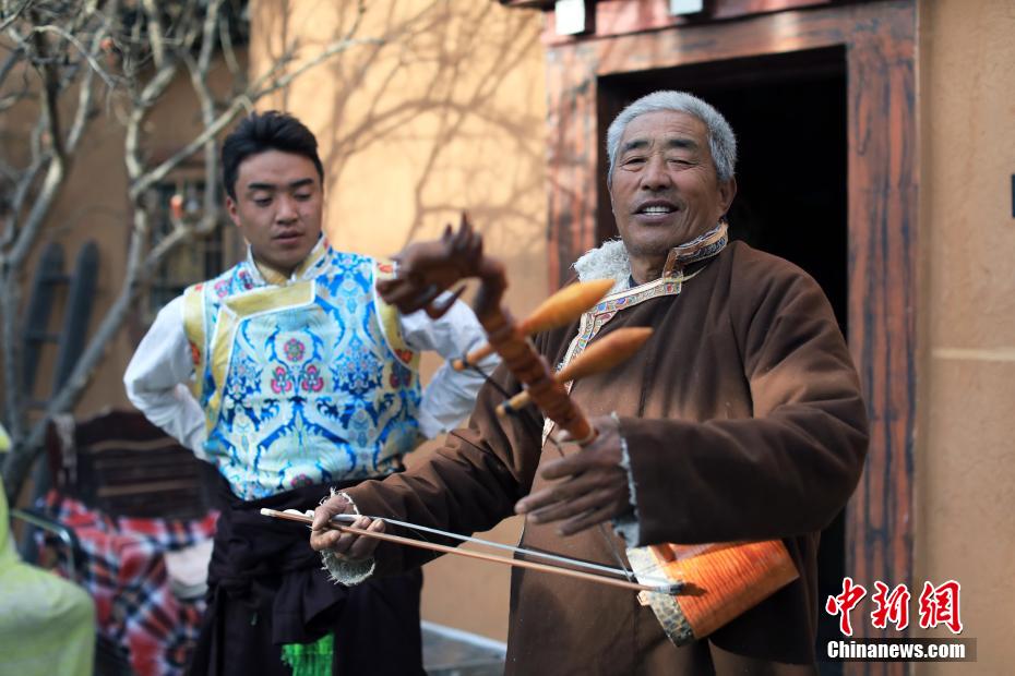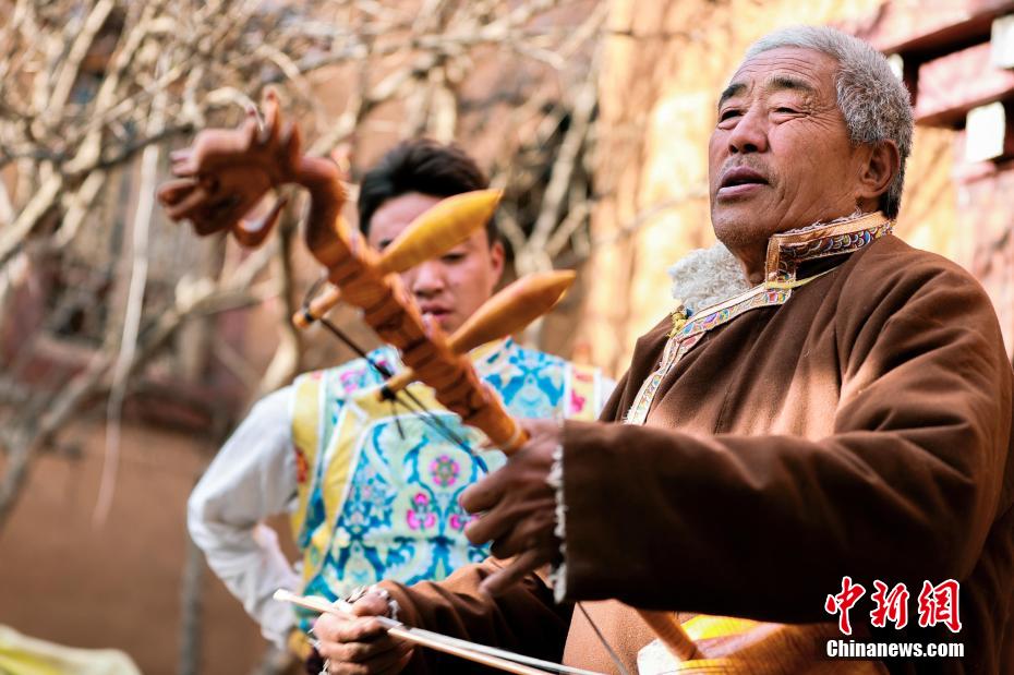 12月21日,四川巴塘,王扎西(右)在自家院中彈奏弦胡。中新社記者 薛蒂 攝