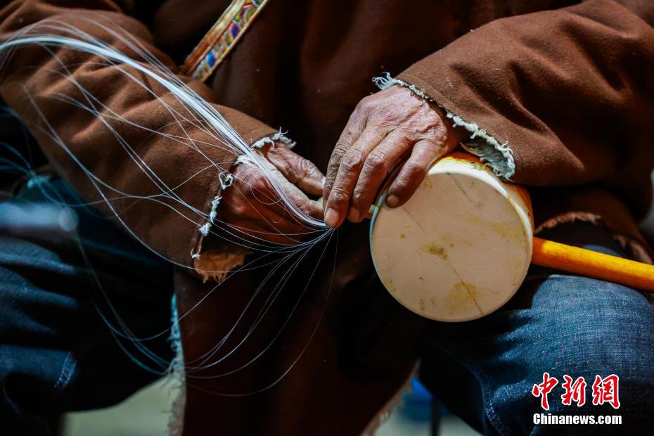 12月21日,四川巴塘,在弦胡制作坊里,王扎西為新制作的弦胡上琴弦。中新社記者 薛蒂 攝
