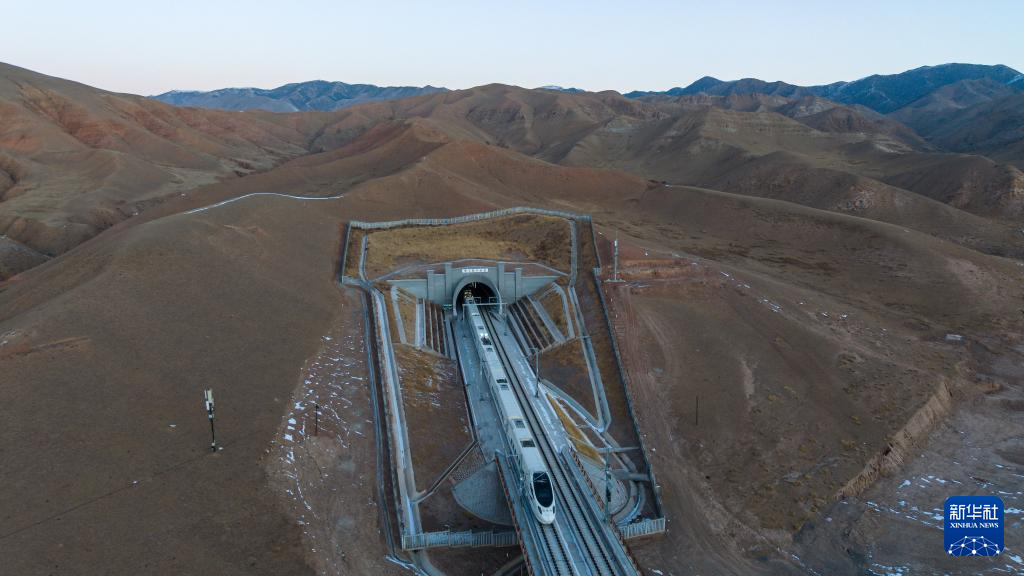 1月14日8時(shí)20分許,蘭州西發(fā)往武威東的D8885次動(dòng)車組列車穿過新烏鞘嶺隧道(無人機(jī)照片)。新華社記者 郎兵兵 攝
