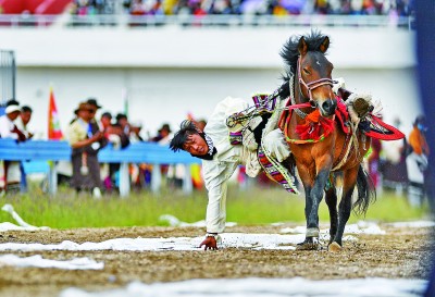 8月10日,2020年那曲羌塘恰青格薩爾賽馬藝術(shù)節(jié)在西藏那曲市格薩爾賽馬場開幕。圖為騎手在藝術(shù)節(jié)開幕式上表演騎馬撿哈達(dá)。新華社記者 張汝鋒 攝