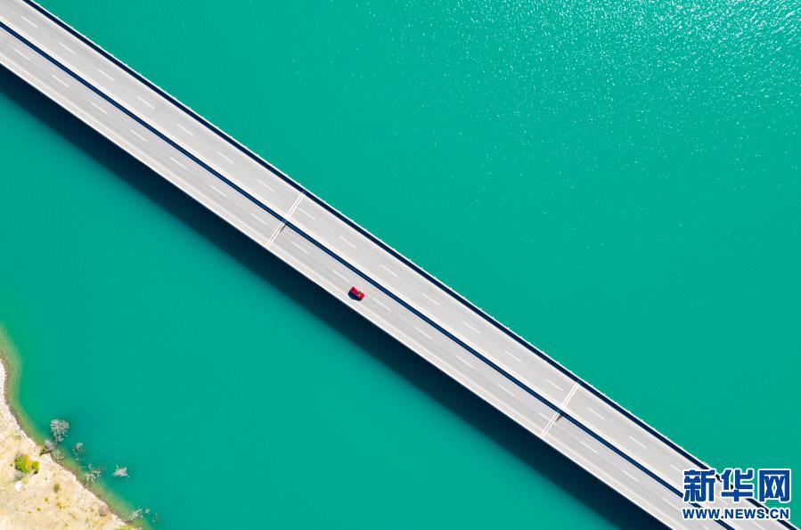 2019年10月28日,一輛汽車經過林芝境內的多布特大橋(無人機拍攝)。新華社記者 普布扎西 攝