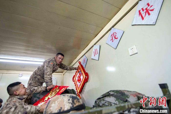 保溫方艙內(nèi),該旅官兵正在用“福”字精心點(diǎn)綴裝飾。 王述東 攝