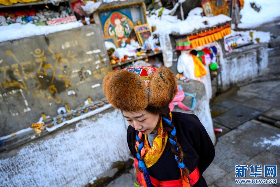 2月12日,在西藏自治區(qū)山南市乃東區(qū)澤當鎮(zhèn),格央和父母一起,在藏歷新年第一天轉山祈福。這是格央在等待取“吉祥水”。新華社記者 劉金海 攝