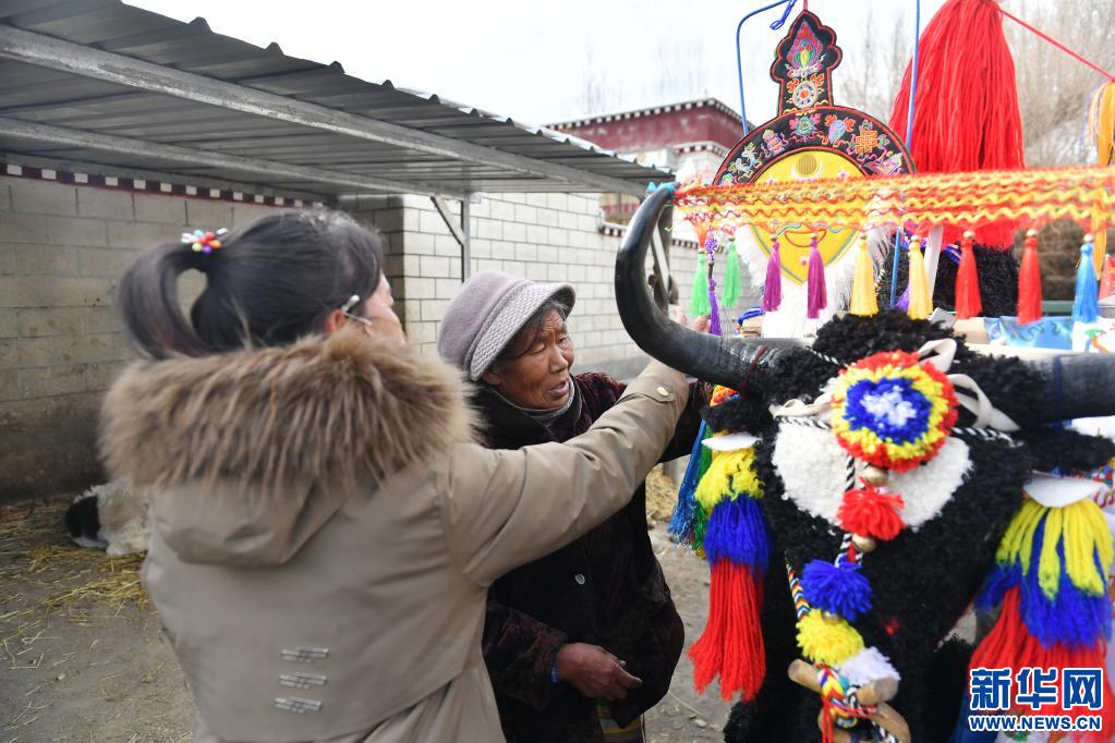 德慶卓瑪(右)和鄰居一起裝飾第二天要參加春耕儀式的拖拉機(3月15日攝)。新華社記者 孫瑞博 攝
