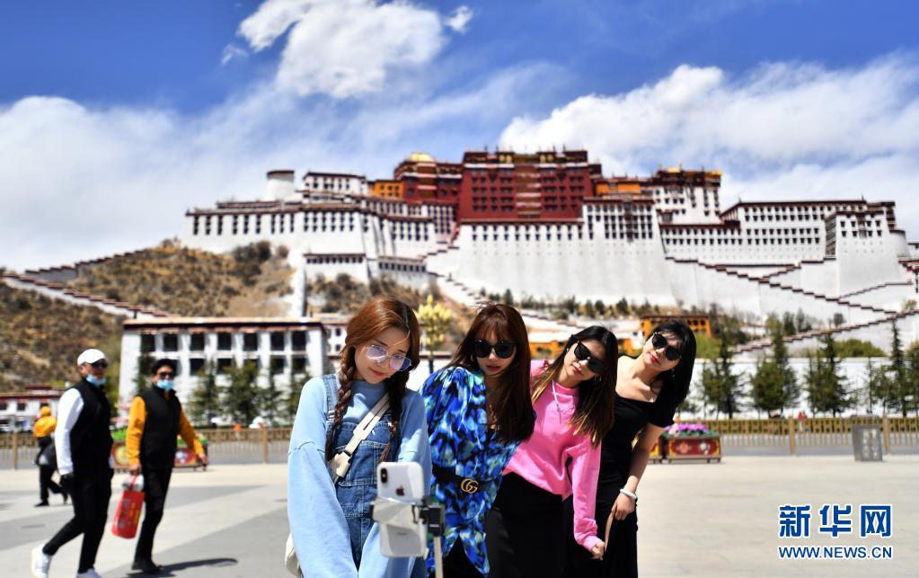 4月23日,來(lái)自重慶的游客在布達(dá)拉宮廣場(chǎng)留影。新華社記者 覺果 攝