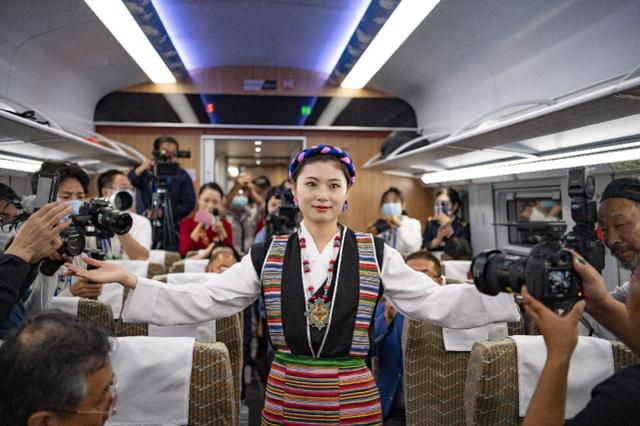 西藏首列復興號的列車員在進行當?shù)胤棻硌?6月25日攝)。 新華社記者 普布扎西 攝