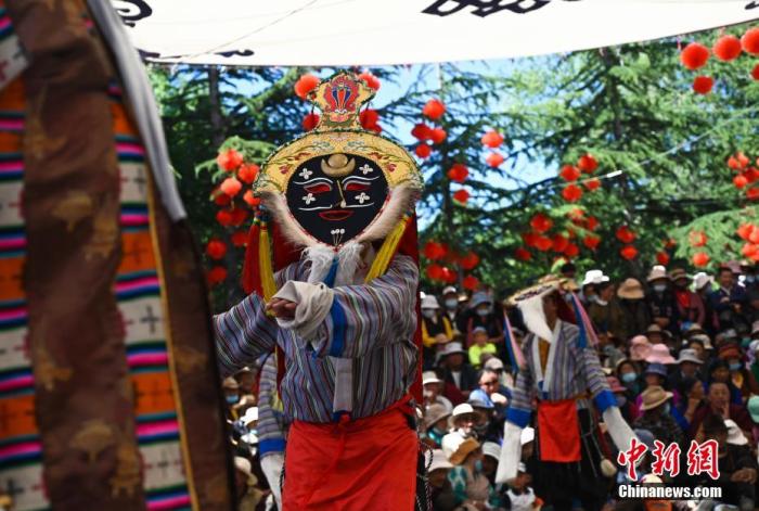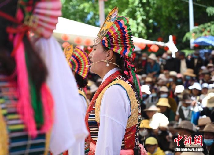 圖為6月26日,拉薩城關(guān)區(qū)次角林藏戲隊(duì)演員正在進(jìn)行表演。中新社記者 趙朗 攝