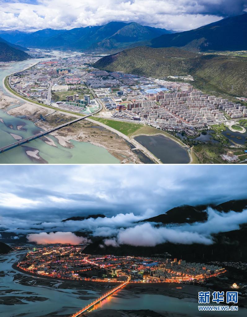 拼版照片:上圖7月19日拍攝的林芝市景色(無(wú)人機(jī)照片,新華社記者 普布扎西 攝);下圖為6月4日拍攝的林芝市夜景(無(wú)人機(jī)照片,新華社發(fā) 董志雄 攝)。