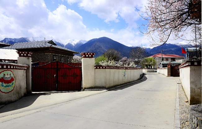 村道整潔平坦,藏式小樓特色十足,家家戶戶飄出花香果香……走進巴吉村,殷實富足的氣息隨處可見。沿著村道一路向里,看到一棟紅瓦黃墻的二層小樓,門口的牌子上寫著“光榮之家”,這就是達龍老人的家。