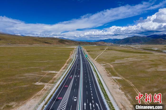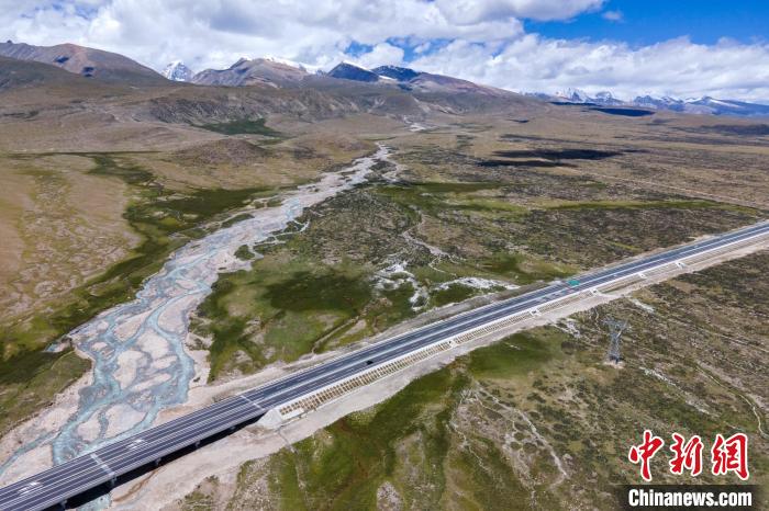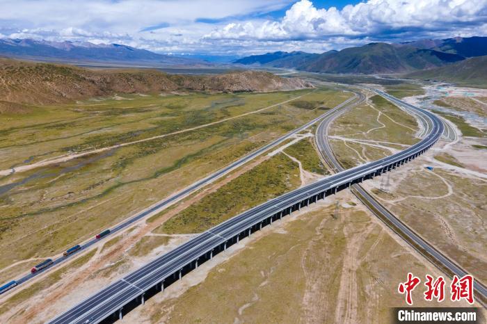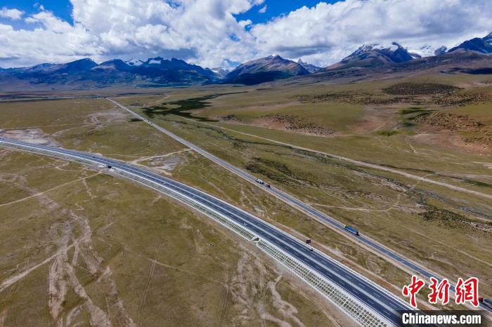那拉高速(畫面下方)、青藏公路和遠處的雪山?!〗w波 攝