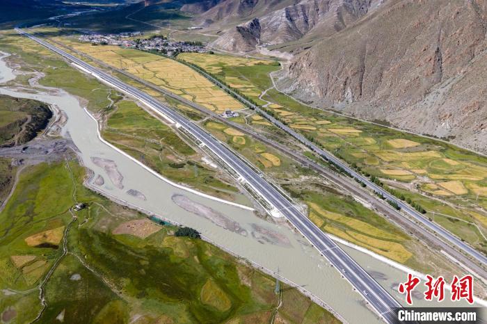 圖為8月27日,航拍西藏那拉高速堆龍德慶段田園風光。 江飛波 攝