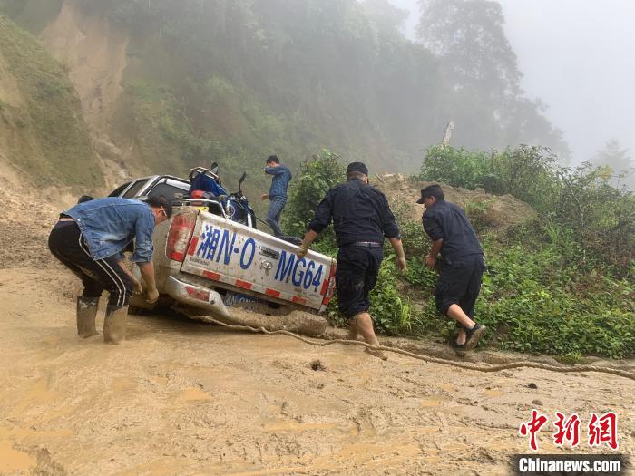 圖為背崩邊境派出所民警對(duì)被困車輛進(jìn)行救援。背崩邊境派出所供圖