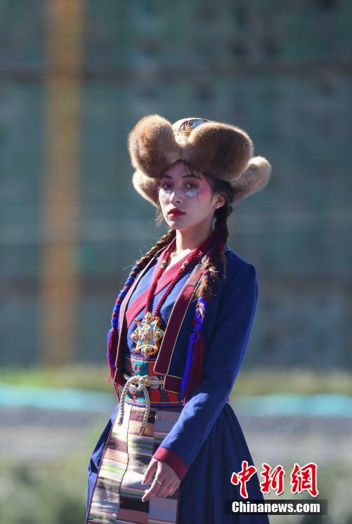 圖為當(dāng)?shù)夭刈迥L厣碇把鹏敳夭肌爆F(xiàn)代藏裝服飾進(jìn)行走秀。貢嘎來松 攝