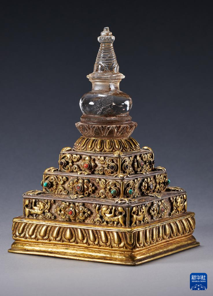 銅鎏金水晶嵌寶石供養(yǎng)塔(資料照片)。記者從9月26日召開的全國文物援藏工作電視電話會議上獲悉,國家文物局將從美國成功追索回國的12件文物藝術品整體劃撥西藏博物館。新華社發(fā)