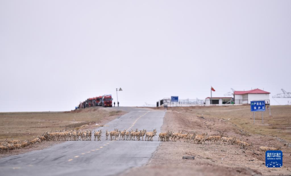 在青??煽晌骼铮蝗捍菩源a(chǎn)藏羚羊正在通過青藏公路(2016年6月7日攝)。新華社記者 吳剛 攝