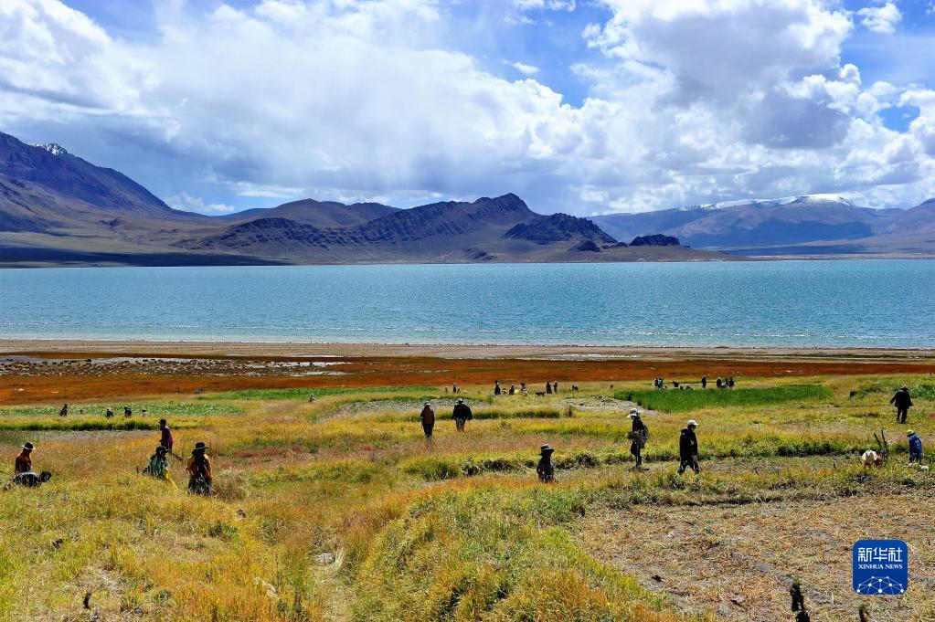 西藏尼瑪縣文部鄉(xiāng)北村村民正在人工草場(chǎng)收割飼草(2017年9月18日攝)。 新華社記者張汝鋒 攝