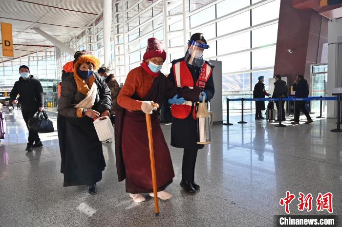 圖為在拉薩貢嘎機(jī)場,多個(gè)臨時(shí)點(diǎn)位安排了志愿者為旅客提供服務(wù)。貢嘎來松 攝