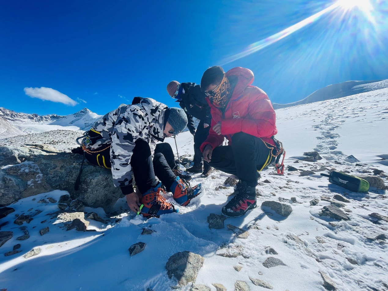 抵達(dá)洛堆峰5600米雪線的位置,三位二十歲出頭的年輕人熟練地在積雪冰壁上打起冰錐,固定路繩,他們在給這些遠(yuǎn)道而來的體驗(yàn)者設(shè)置技能訓(xùn)練路線。