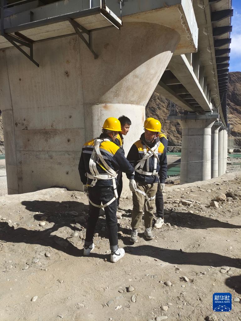 冷達(dá)2號(hào)雅魯藏布江特大橋橫跨雅魯藏布江?!?0后”橋隧工趙浩澤穿著亮黃色安全馬甲,系好安全帶,開始檢查抗震樁、支座和支撐墊石的情況。