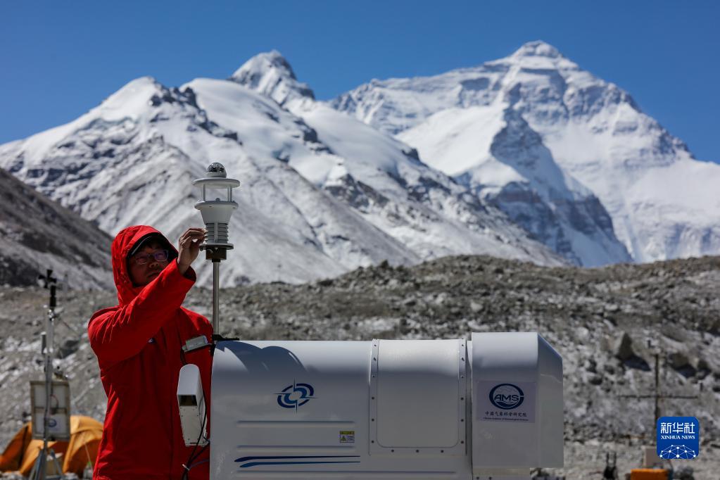 5月3日,在珠峰登山大本營(yíng),科研人員檢查微波輻射計(jì)。新華社記者 姜帆 攝