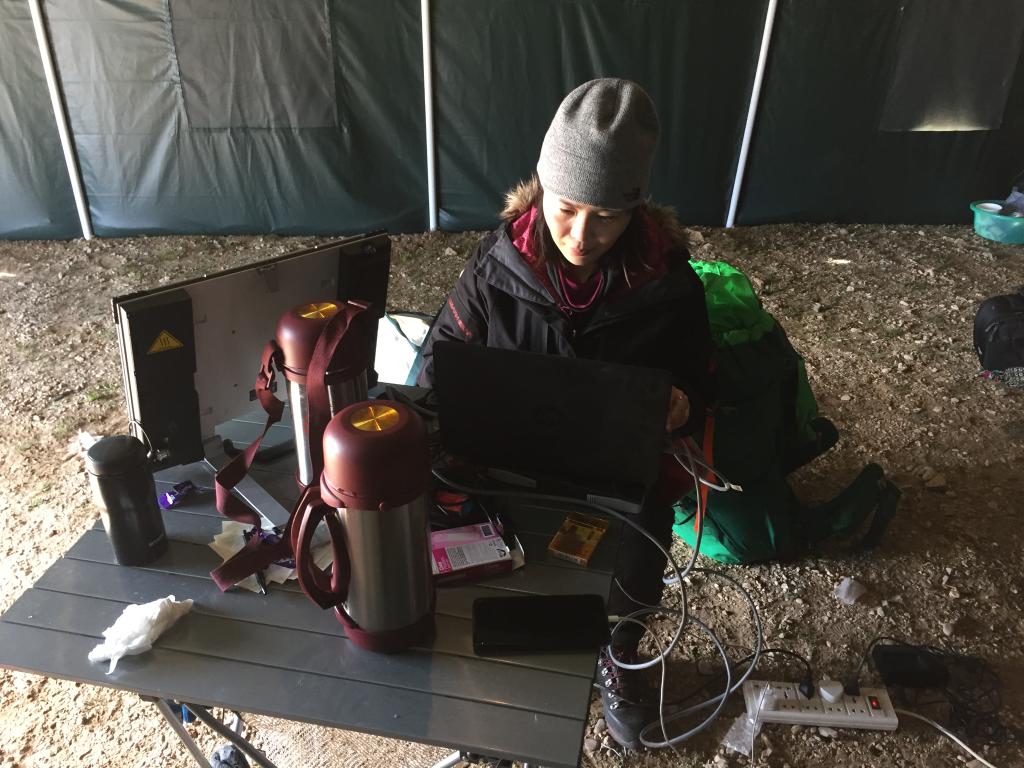 2017年6月,記者在青藏科考色林錯(cuò)營地帳篷里寫稿。