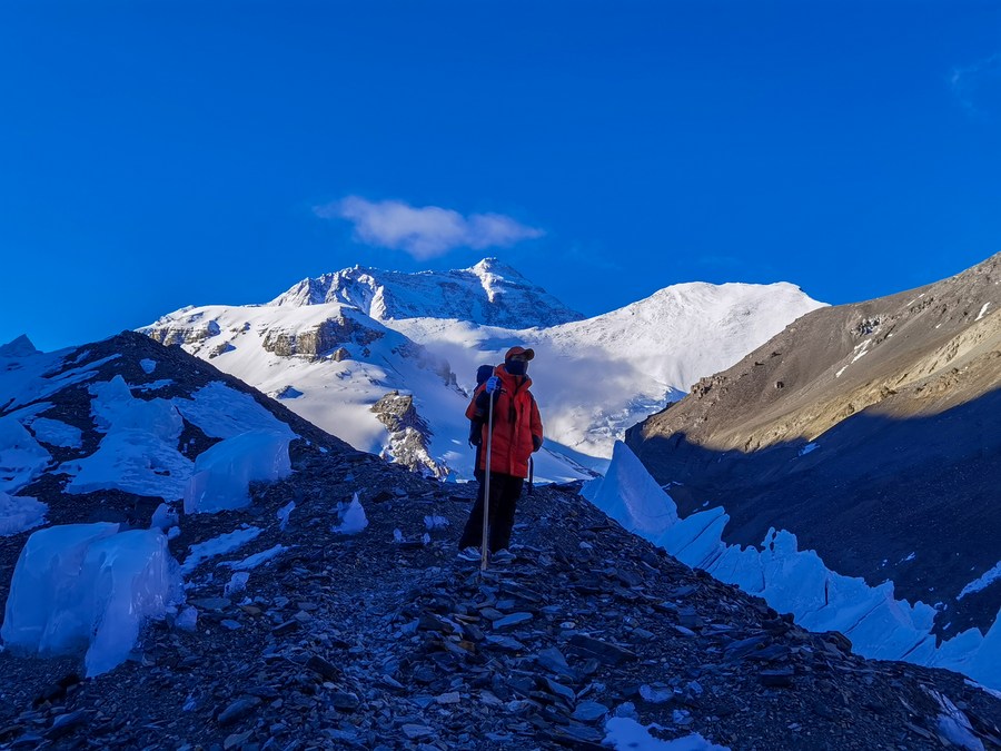 冰川與污染物小組在東絨布冰川觀察測量(5月6日攝,手機照片)。新華社發(fā)(受訪者供圖)