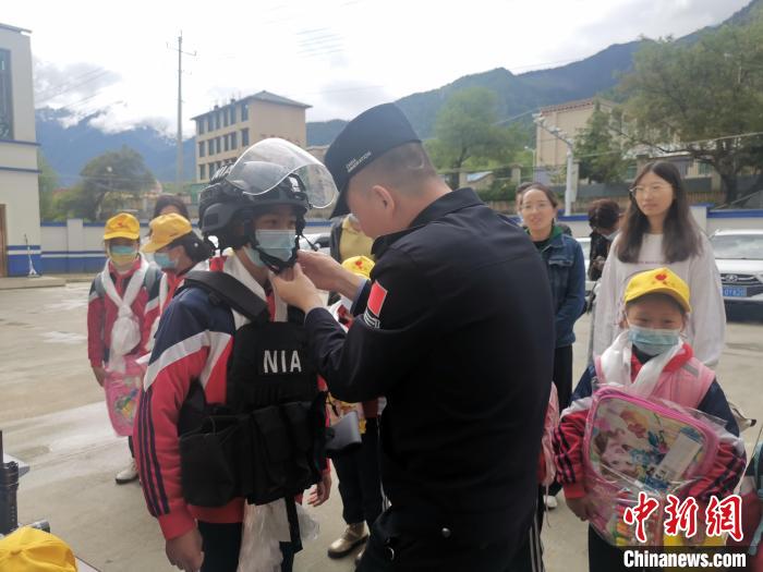圖為民警為小學(xué)生穿戴警用裝備。派邊境派出所供圖