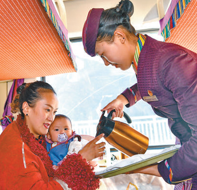 青藏鐵路延長(zhǎng)線拉日鐵路Z8801次列車上,乘務(wù)員在為乘客倒水。新華社記者 張汝鋒攝