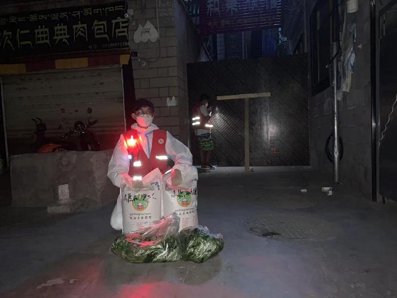8月22日,正在嘎瑪貢桑志愿服務(wù)的救援隊隊員李正煒聯(lián)系社區(qū)工作人員,核實情況,了解這個家庭的需求后,副隊長朱奕霖采購物資,晚上隊長陳雷將嘉措居委會、八一社區(qū)、第十一安居苑等社區(qū)的捐贈防疫物資配送完畢后,回到東郊,將糌粑、蔬菜等食品送往嘎瑪貢桑高風(fēng)險區(qū),交到了救助家庭人員的手中。