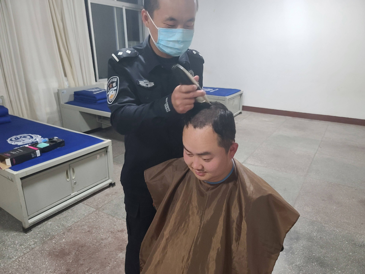 在隔離酒店執(zhí)勤的副所長(zhǎng)王士博,在完成工作后請(qǐng)同事幫忙給自己剃了個(gè)光頭,“當(dāng)前疫情防控形勢(shì)嚴(yán)峻,天氣逐漸變暖,每天穿著防護(hù)服工作,一身都是汗?!蓖跏坎┱f(shuō),剃掉頭發(fā)后更加涼快,在節(jié)省時(shí)間的同時(shí)也能避免頭發(fā)沾染病毒,更加安全。