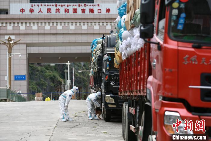 吉隆出入境邊防檢查站移民管理警察對外出口岸限定區(qū)域車輛進(jìn)行消毒?!⌒じ毁F 攝