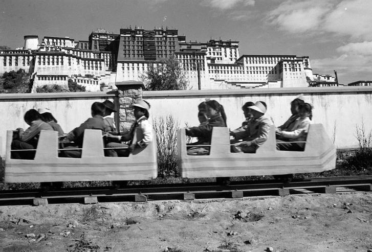 1987年10月1日,在拉薩勞動(dòng)人民文化宮內(nèi)新建成一座大型游樂(lè)場(chǎng)里,小朋友們?cè)诔俗妱?dòng)小火車(chē)。
