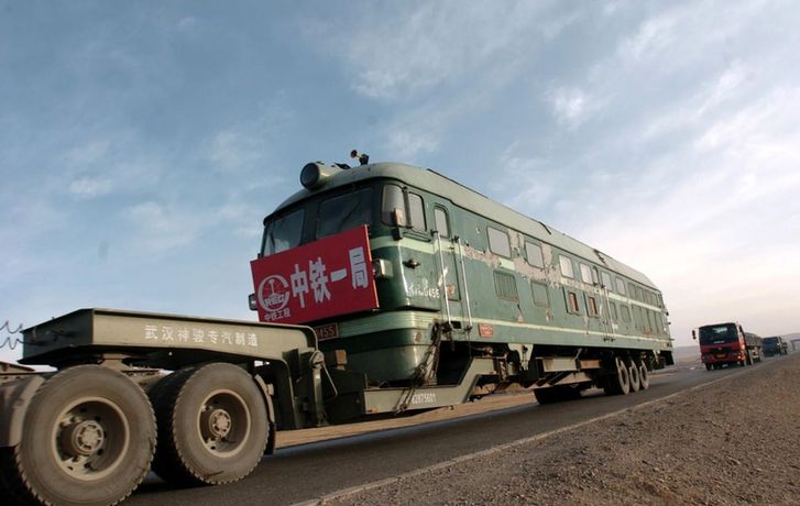 2005年4月19日,一輛汽車(chē)上裝著一輛機(jī)車(chē),從青海省格爾木市秀水河車(chē)站經(jīng)過(guò)青藏公路向西藏安多方向行駛。青藏鐵路建設(shè)總指揮部從2004年3月開(kāi)始陸續(xù)把近200臺(tái)機(jī)車(chē)、鋪軌機(jī)、架橋機(jī)、軌道車(chē)等大型鋪架設(shè)備用汽車(chē)從格爾木安全運(yùn)抵西藏安多,途中翻越海拔5231米的唐古拉山埡口,創(chuàng)造了鐵路建設(shè)史上的奇跡。